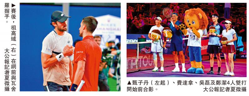 左圖:賽後,祖高域(右)在網前與瓦舍羅握手。右圖:甄子丹(左起)、費達拿、吳磊及鄭潔4人雙打開始前合影。\大公報記者夏微攝
