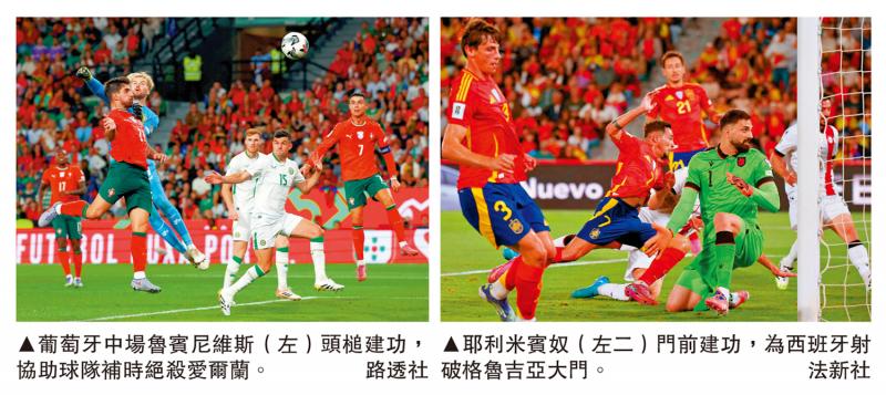 【大公報訊】西班牙與葡萄牙於12日凌晨完成世界盃外圍賽後「半程領放」。F小組的葡萄牙在主場對陣愛爾蘭,雖然C朗拿度75分鐘12碼宴客,但葡萄牙中場魯賓尼維斯於補時階段1分鐘的入球幫助主隊以1:0取勝。至於E小組的西班牙則鬥格魯吉亞,前者則憑耶利米賓奴、奧耶沙巴爾的入球,最終以2:0全取三分。現時「雙牙」皆完成一半小組賽,3場賽事全取9分,領跑各自的小組積分榜。