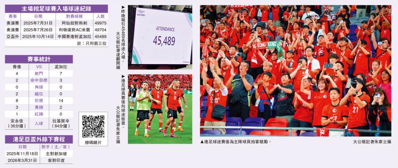 中國香港男子足球代表隊昨晚(14日)重返啟德體育園主場館出戰,在再創主場入座紀錄的45489名球迷(舊紀錄是42570人)見證下,雖然主隊憑着安永佳於上半場射入12碼而領先1:0,但在下半場末段失守而被孟加拉隊逼和1:1,港足在2027年亞洲盃外圍賽第3圈C組暫以4戰取得8分。港足球迷全場不斷地為主隊吶喊助威,將主場館氣氛推至高潮。\大公報記者 朱家立