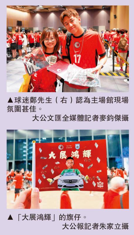 上圖:球迷鄭先生(右)認為主場館現場氛圍甚佳。\大公文匯全媒體記者麥鈞傑攝;下圖:「大展鴻輝」的旗仔。\大公報記者朱家立攝