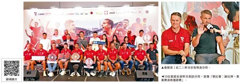 左圖:10位英超名宿昨日到訪沙田,宣傳「雙紅會:謝拉特、里奧費迪南邀請賽」。右圖:韋斯活(右二)昨日亦有現身沙田。