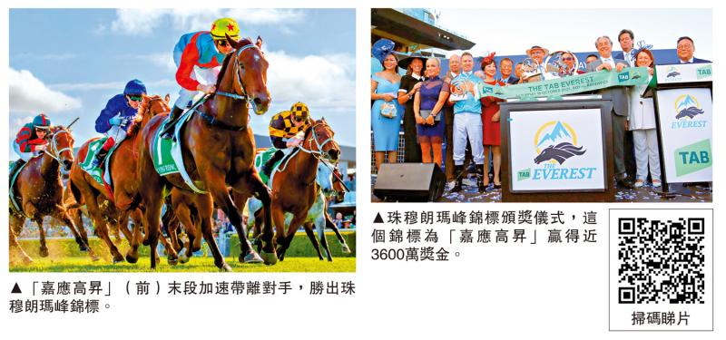 左圖:「嘉應高昇」(前)末段加速帶離對手,勝出珠穆朗瑪峰錦標。右圖:珠穆朗瑪峰錦標頒獎儀式,這個錦標為「嘉應高昇」贏得近3600萬獎金。