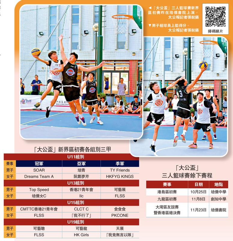 由《大公報》主辦、香港賽馬會首席贊助、獎品總值35.2萬元的2025第3屆「大公盃」三人籃球賽香港賽區19日揭開戰幔,在培僑書院率先上演新界區初賽。全日賽事上演多場激戰,氣氛熱烈,參賽選手拚盡全力爭取佳績,最終決出男、女子U11、U13、U15、U19共4個組別的8隊冠軍,加上8隊亞軍,共有16隊獲得11月23日在培僑書院舉行的總決賽參賽資格。\大公報記者 張銳