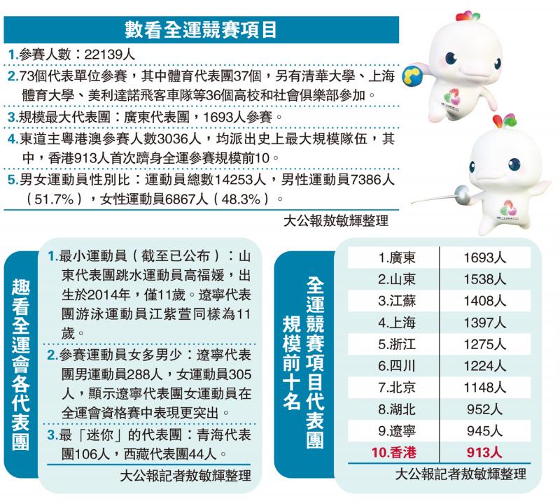 4.東道主粵港澳參賽人數3036人,均派出史上最大規模隊伍,其中,香港913人首次躋身全運參賽規模前10。