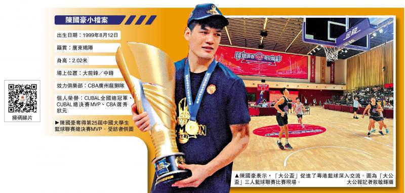左圖:陳國豪奪得第25屆中國大學生籃球聯賽總決賽MVP。\受訪者供圖;右圖:陳國豪表示,「大公盃」促進了粵港籃球深入交流。圖為「大公盃」三人籃球聯賽比賽現場。\大公報記者敖敏輝攝