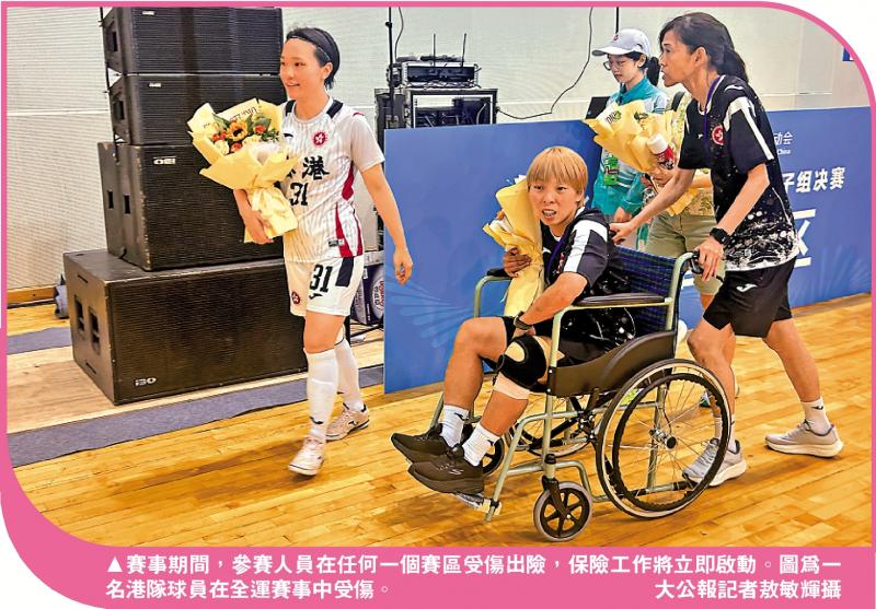 圖:賽事期間,參賽人員在任何一個賽區受傷出險,保險工作將立即啟動。圖為一名港隊球員在全運賽事中受傷。\大公報記者敖敏輝攝