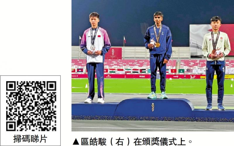 【大公報訊】記者張銳報道:中國香港代表團於巴林2025亞洲青年運動會(亞青運)傳來捷報,區皓駿於24日(周五)凌晨在田徑男子1500米項目奪得銅牌,亦是中國香港代表團在今屆亞青運的首枚獎牌。港協暨奧委會賽後向區皓駿及田徑隊致以由衷祝賀。