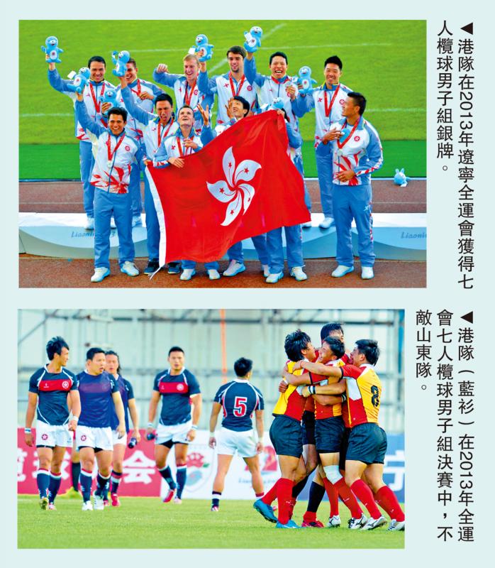 上圖:港隊在2013年遼寧全運會獲得七人欖球男子組銀牌。下圖:港隊(藍衫)在2013年全運會七人欖球男子組決賽中,不敵山東隊。