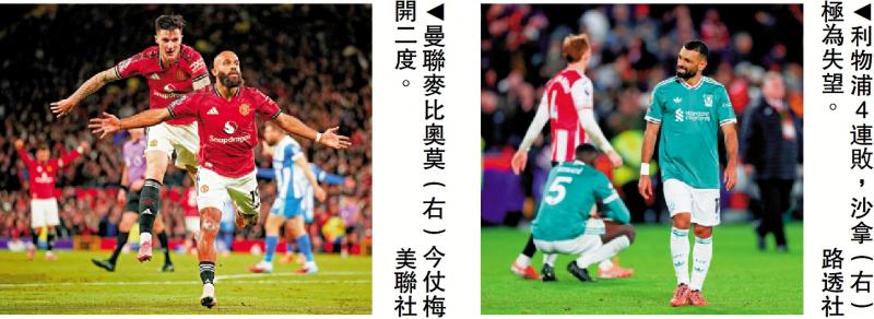 左圖:曼聯麥比奧莫(右)今仗梅開二度。\美聯社;右圖:利物浦4連敗,沙拿(右)極為失望。\路透社