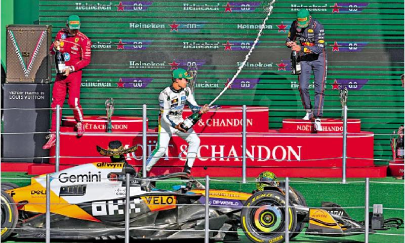 【大公報訊】2025世界一級方程式大賽車(F1)墨西哥站周日舉行正賽,麥拿侖車隊的英國車手諾里士順利在桿位發車贏得冠軍,以1小時37分58秒574率先衝線,贏得冠軍後的諾里士在車手積分榜累積357分,得以1分之差暫時反超隊友澳洲車手比斯迪排名榜首。