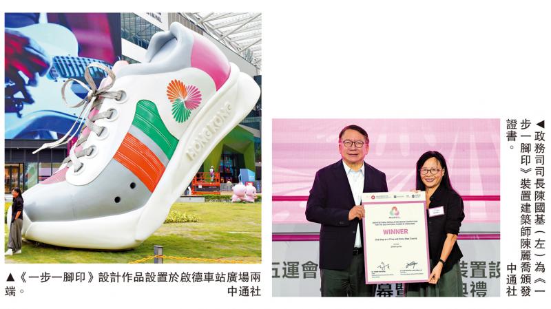 左圖:《一步一腳印》設計作品設置於啟德車站廣場兩端。右圖:政務司司長陳國基(左)為《一步一腳印》裝置建築師陳麗喬頒發證書。\中通社