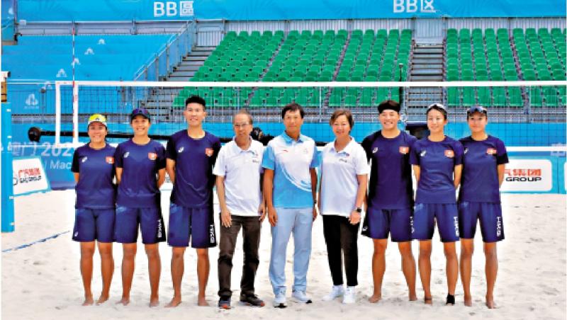 圖:楊德強(左五)視察場地後與港隊沙排代表合照。\大公報記者張銳攝