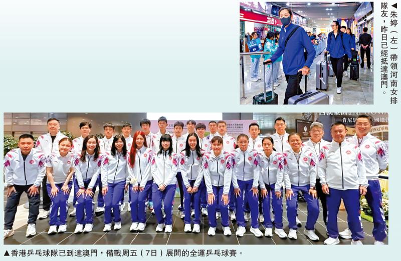 上圖:朱婷(左)帶領河南女排隊友,昨日已經抵達澳門。下圖:香港乒乓球隊已到達澳門,備戰周五(7日)展開的全運乒乓球賽。