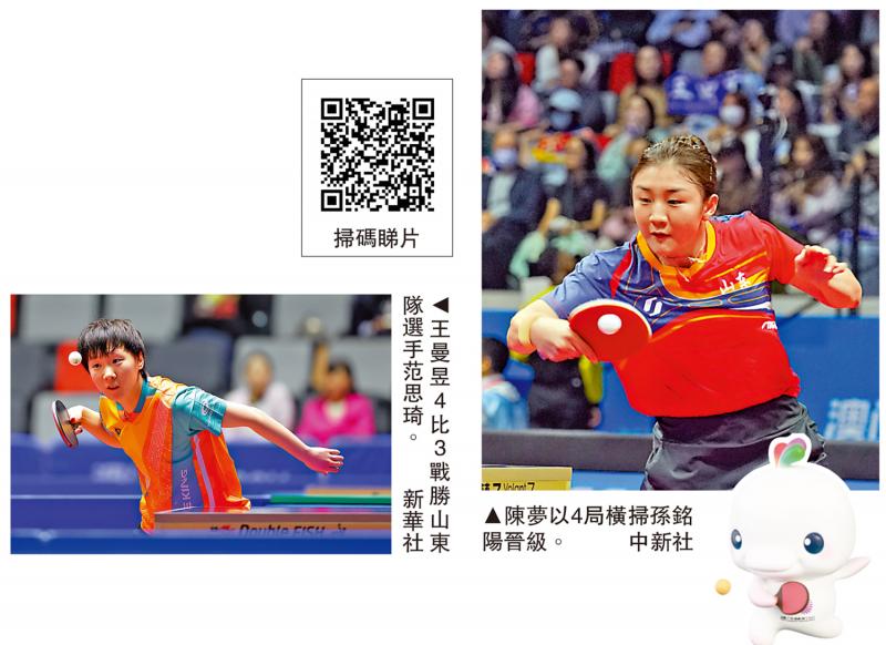 【大公報訊】記者梁潤森報道:全運會乒乓球項目昨(11日)繼續單打賽事,繼巴黎奧運男單金牌得主樊振東及世界「一姐」孫穎莎後,其餘國家隊奧運成員亦相繼亮相並旗開得勝。女單32強,巴黎奧運兩金得主的陳夢休整後首度參加正式比賽,她代表山東隊以局數4:0橫掃上海隊的孫銘陽晉級;黑龍江隊的王曼昱則以4:3險勝山東隊的范思琦。