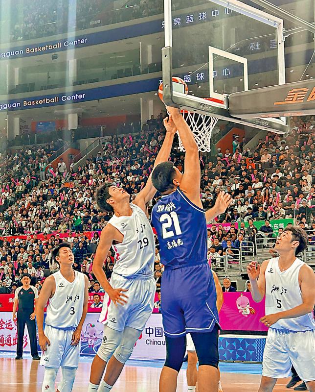 圖:廣東隊球員(藍衫)上籃得分。\大公報記者敖敏輝攝