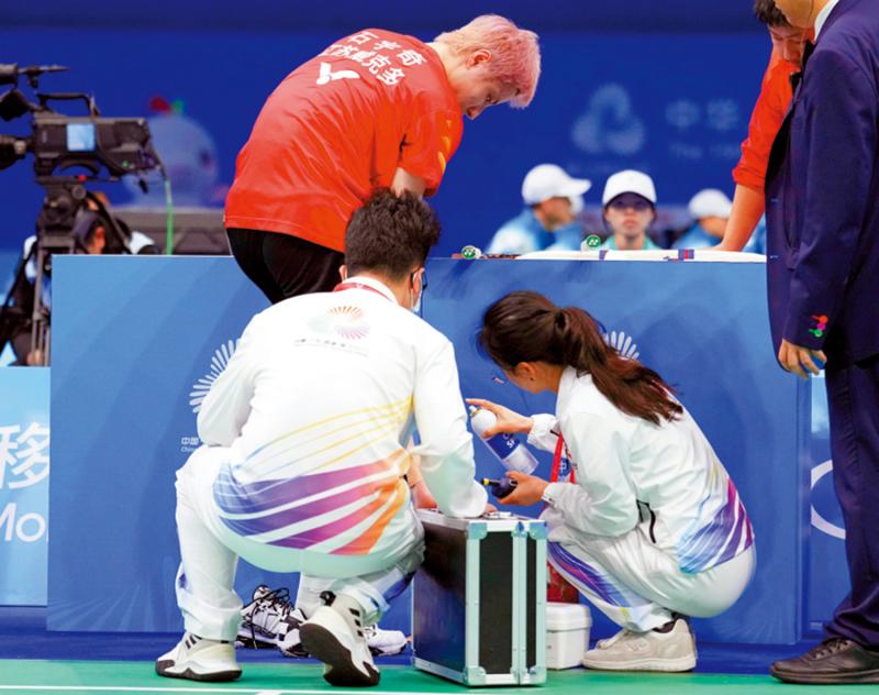 圖:石宇奇(上左)在比賽中接受治療。\中新社