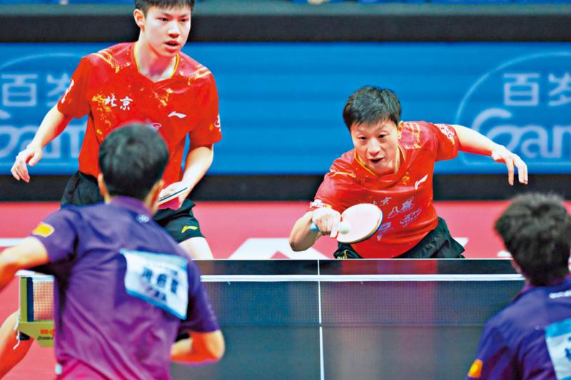 圖:北京隊組合馬龍(右)/黃友政在比賽中。\新華社