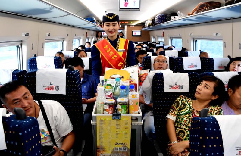 圖:乘務員在鄭徐高鐵首趟動車組列車上為乘客服務 新華社