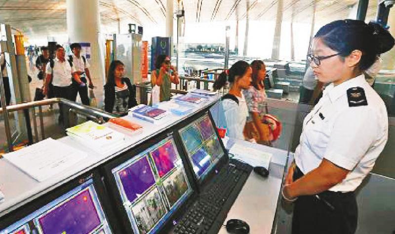 圖:在北京首都國際機場,出入境檢驗檢疫局工作人員監控入境旅客體溫,進行傳染病檢查 資料圖片