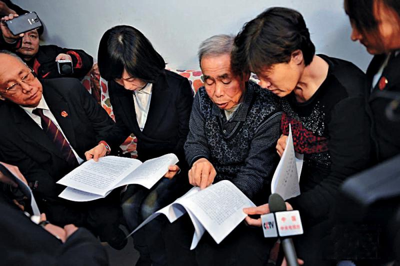 圖:2014年12月,內蒙古高院工作人員將判定其無罪的法律文書送達呼格吉勒圖父母家 資料圖片