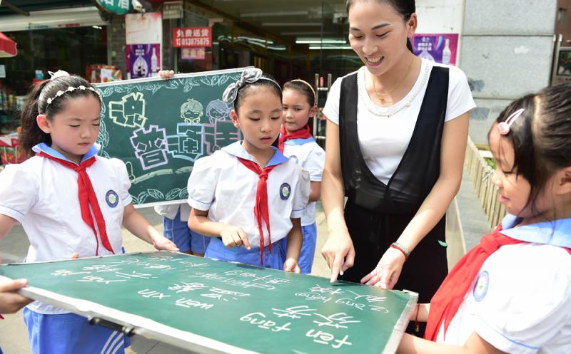圖:13日,安徽合肥市朝霞小學學生上街頭開設「小課堂」,邀請市民說普通話、寫規範字 新華社