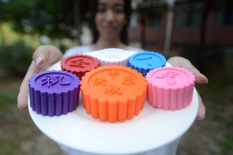 圖:揚州大學機械工程學院的學生們利用3D打印機,動手設計並製作出色彩鮮艷的月餅模型,迎接中秋節到來 新華社