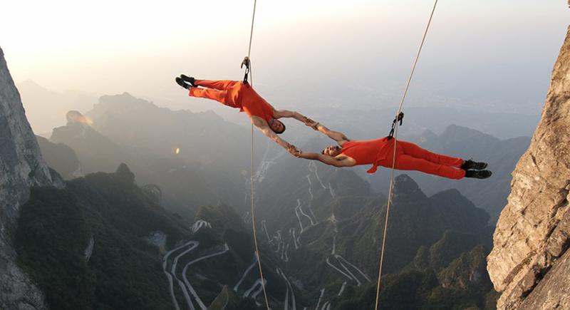 圖:兩名舞者在天門山玉壺峰崖壁演繹懸崖舞蹈