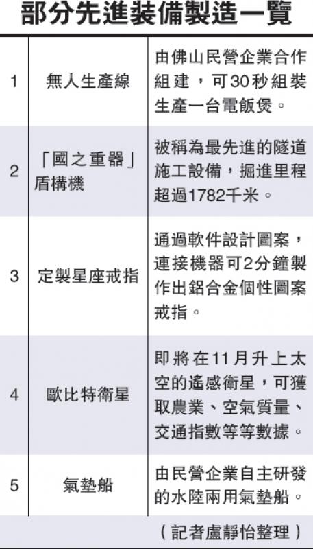 廣東升級全球先進裝備製造業基地。第二屆珠江西岸先進裝備製造業投洽會29日在佛山舉行,會上簽約先進裝備製造業項目220個,總投資額超過2307.7億元(人民幣,下同,約合2685.9億港元)。項目相對上屆更為高端,涉及智能裝備製造、軌道交通、新能源等先進領域。為更好整合研發能力,19家內地民企「抱團」合作,組建了首條珠江西岸智能製造「無人生產線」,可30秒組裝產出一台電飯煲。」大公報記者盧靜怡佛山報道