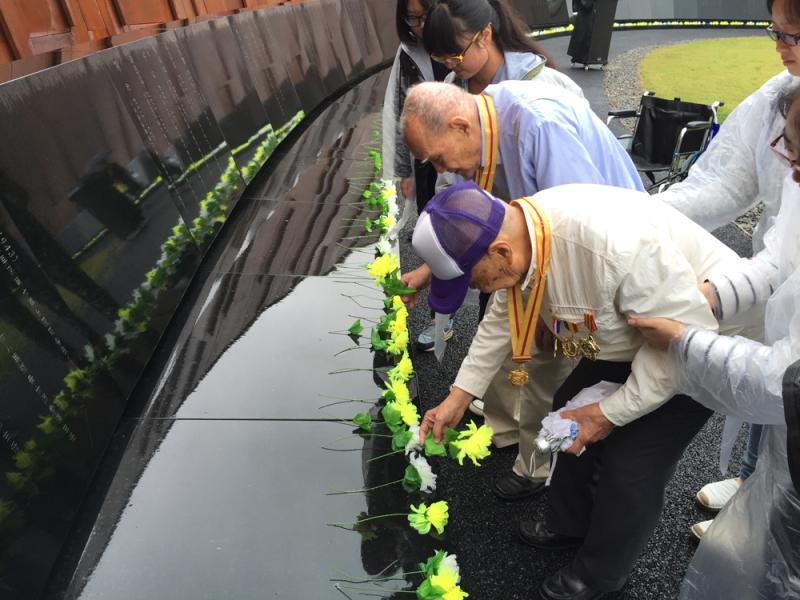 圖:抗戰老兵張修齊(前)與楊伯琪向英烈碑獻花\大公報記者田雯攝