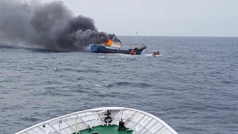 圖:9月29日在全羅南道新安郡附近海域拍攝的起火的中國漁船\新華社