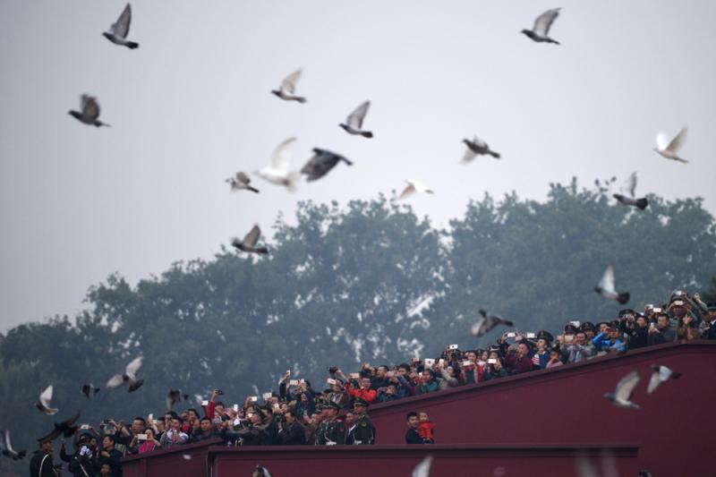 圖:超過10萬人觀看天安門廣場國慶升旗儀式,儀式後和平鴿展翅飛起/新華社