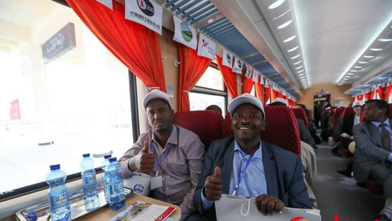 圖:乘搭亞吉鐵路首發列車的當地民眾為鐵路豎起了大拇指\人民網