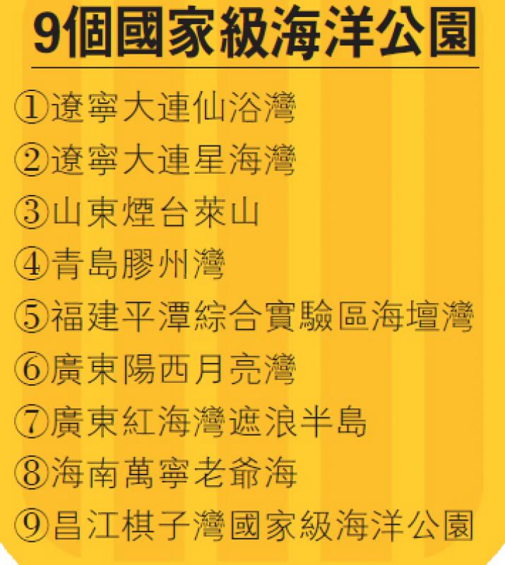 國家海洋局日前發布新增9個國家級海洋公園名單。根據國家海洋局印發的《關於批准建立大連仙浴灣等9處國家級海洋公園的通知》,此次新增的9個國家級海洋公園分別為:遼寧大連仙浴灣、大連星海灣,山東煙台萊山、青島膠州灣,福建平潭綜合實驗區海壇灣,廣東陽西月亮灣、紅海灣遮浪半島,海南萬寧老爺海、昌江棋子灣國家級海洋公園。這9家國家級海洋公園均屬海洋特別保護區。至此,中國國家級海洋公園已增至42個。