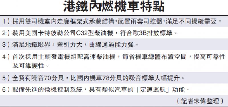 據了解,此次交付港鐵的內燃機車突出綠色環保、人性化和先進性三大設計理念。柴油機排放達到歐ⅢB排放標準,機車在全工況下,司機室噪聲不超過70分貝,遠低於國際78分貝標準。機車配置兩套司控器系統,讓司乘人員既可在中間操縱,又可在側窗位置操縱。機車主輔傳動全部實現微機控制,採用主輔一體式發電機組配合高速柴油機的主傳動方式,取消變速箱等傳動裝置,大幅提高機車可靠性和可維護性。此外,機車具有類似汽車的「定速巡航」等先進功能,減少操作頻率,節省燃料。