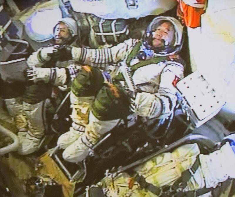 圖:17日,神舟十一號載人飛船升空,兩名航天員景海鵬(右)和陳冬在任務節點順利完成後相互握手/新華社