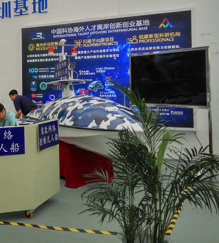 記者在場內見到不少觀眾在圍觀一內地首款完全自主知識產權無人船,該無人船由深圳三方海洋探測技術研究所自行設計研發。操作人員示範只需在場內操控台上輸入相關指令,遠在浙江台州附近海域的無人船隻便能將現場水域的實時信息圖像傳到顯示屏上。