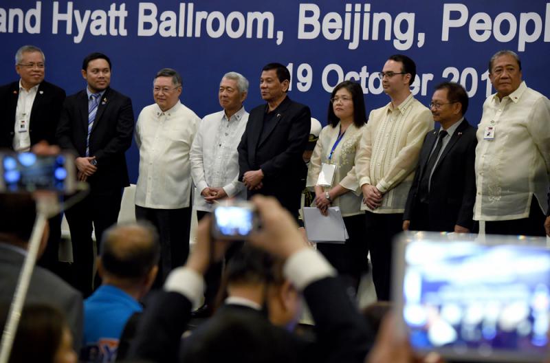 圖:菲律賓總統杜特爾特(中)在北京會見在華工作、生活的菲律賓人代表。菲律賓外長亞塞(左四)、財政部長多明戈斯(左三)、國家安全顧問埃斯佩隆(右二)等高官隨同杜特爾特出席會見/中新社