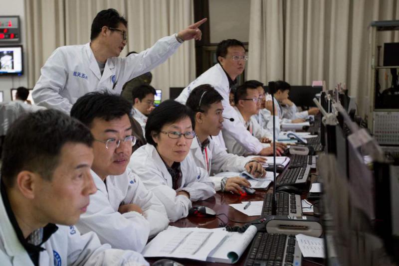 圖:19日凌晨,北京航天飛行控制中心工作人員在緊張工作中/新華社