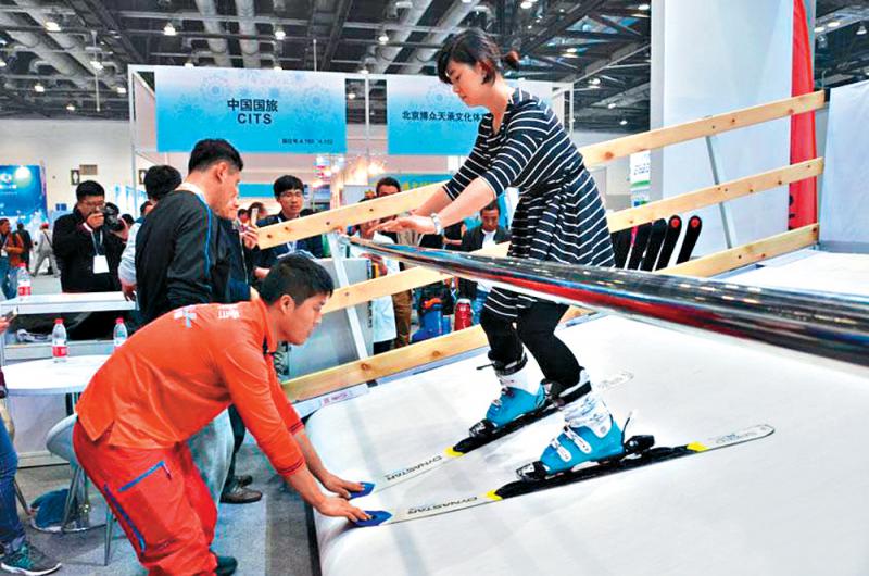 圖:首屆冬博會在京開幕,圖為觀眾在現場體驗冰雪運動/網絡圖片