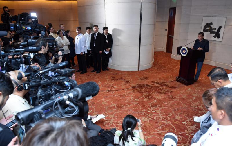 圖:19日,正在對中國進行國事訪問的菲律賓總統杜特爾特在北京舉行記者會,會見中外記者並回答提問/中新社