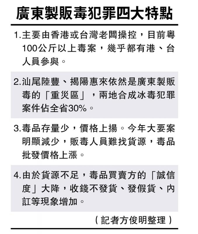 【大公報訊】記者方俊明廣州報道:目前,汕尾陸豐、揭陽惠來合成冰毒犯罪活動佔廣東省30%,主要銷往內地和港澳地區。在廣東警方20日發布十大通緝犯名單中,有5人來自陸豐「三甲」地區,1人來自惠來。如排在首位的A級通緝犯李俊鵬,就出自陸豐甲子鎮。