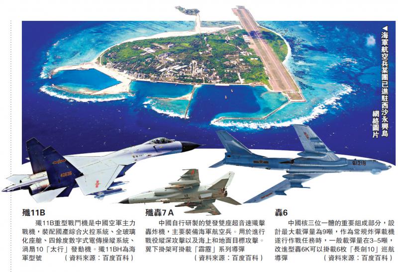 【大公報訊】綜合《解放軍報》、觀察者網報道:10月上旬,南海艦隊航空兵某團戰機帶彈起飛,利用南海島礁機場未來將執行的多種任務,例如驅逐外國反潛機,掩護我方潛艇、爭奪海上制空權、利用島礁機場為備降基地擴展航空兵活動範圍等,展開一場多機種立體攻防對抗演練。據介紹,該團已「轉駐某海島機場、擔負戰備值班任務」,這顯然指進駐西沙永興島機場的海軍航空兵某團。