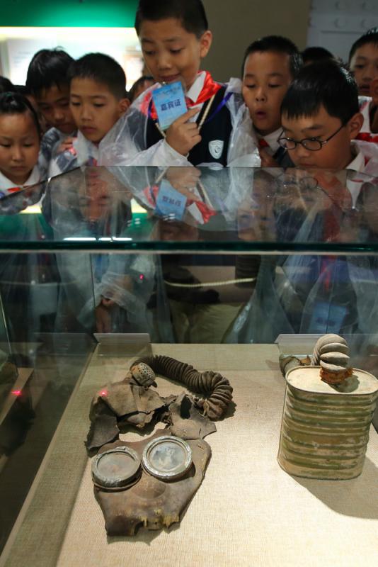 圖:南京小學生參觀展出的侵華日軍防毒面具過濾器和防毒面具/中新社