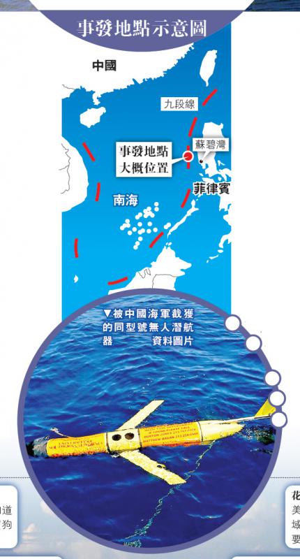 中美在南海再起爭端。就美國聲稱中國軍艦15日在南海扣留美國海軍一個無人水底潛航器,華府提出外交抗議並要求中方立即歸還一事,中國國防部17日晚間表示,中國海軍一艘救生船在南海有關海域發現一具不明裝置,為預防發生航行安全問題,對裝置進行了識別查證。經核查,該裝置為美方無人潛航器。國防部強調,長期以來,美軍頻繁派艦機在中國當面海域進行抵近偵察和軍事測量,中方對此堅決反對,要求美方停止此類活動。/大公報記者葛沖北京報道