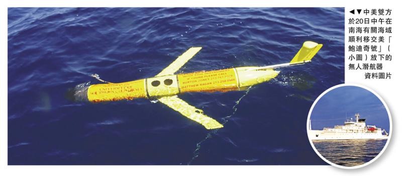 圖:中美雙方於20日中午在南海有關海域順利移交美「鮑迪奇號」(小圖)放下的無人潛航器/資料圖片