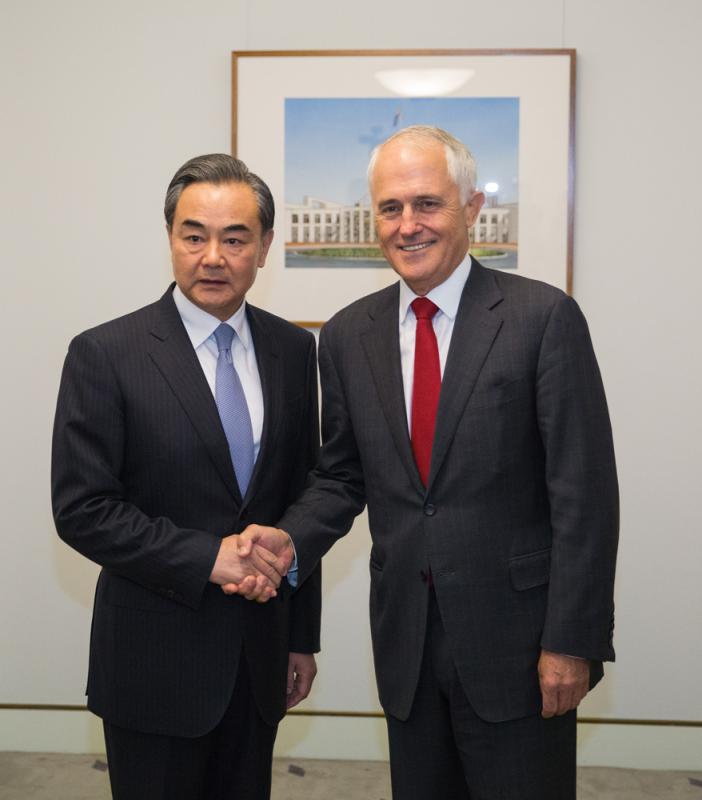 圖:7日,澳洲總理特恩布爾(右)在堪培拉會見中國外交部長王毅\新華社