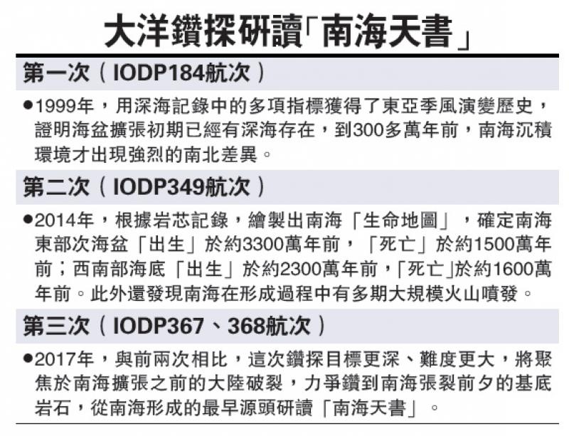 中國1998年加入該計劃以來,以南海為重點,先後設計和主導了兩次南海大洋鑽探。通過深海鑽探獲取的科學研究樣品,揭示了南海氣候演變和海盆形成過程,為研究邊緣海構造和環境變化規律提供了寶貴資料。例如確定了南海東部次海盆「出生」於3300萬年前,「死亡」於1500萬年前;西南部海底「出生」於2360萬年前,「死亡」於1600萬年前。