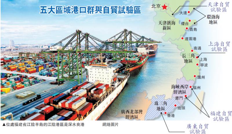 記者獲悉,到2030年,內地將完善現代水運體系,並進一步優化環渤海、長三角、珠三角、東南沿海和西南沿海地區五大區域港口群布局,藉以形成優勢互補、功能完善之現代港口體系。此外,在上海、廣東、天津、福建已有自貿試驗區的基礎上,將進一步擴圍自貿區建設,屆時,自貿區和五大區域港口群將共同擔當內地「一帶一路」建設重要節點的作用。