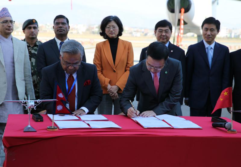 圖:8日,中尼雙方在尼泊爾首都加德滿都特里布萬國際機場舉行了兩架中國產飛機的交付儀式/中新社