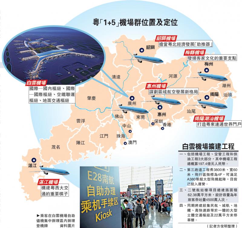 廣東建設「民航強省」再有新進展。連日來,廣東省機場集團與惠州、揭陽、梅州、韶關、湛江5市共商全省機場規劃發展大計,加快推動在全省形成「樞紐、幹支線機場協同發展」的民用機場網絡。其中,廣州白雲機場規劃建設高品質的「國際─國內樞紐、國際─國際樞紐、空鐵聯運樞紐、地面交通樞紐」4大樞紐;而耗資近200億元(人民幣,下同,約226億港元)的擴建工程竣工後,硬件設施將達到世界級水準。專家稱,這對毗鄰的香港機場形成更大的挑戰,但也有利於助力粵港澳加快建成世界級城市群。/大公報記者方俊明廣州報道
